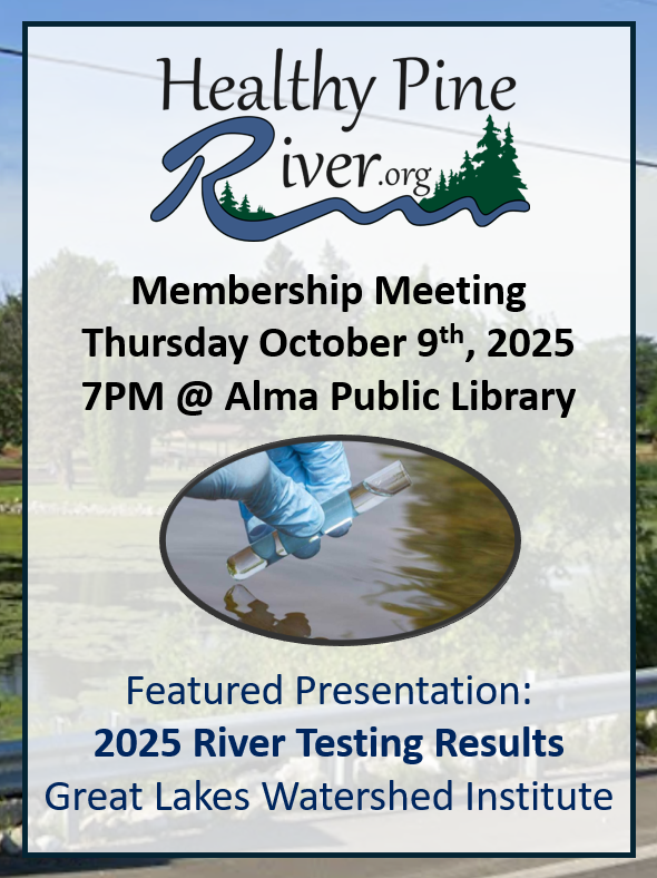 This summer’s Pine River water testing results will be presented by Alma College’s Great Lakes Watershed Institute during the October Healthy Pine River Membership Meeting. The meeting will be at Alma Public Library at 7:00PM, October 9th, 2025. All Healthy Pine River membership meetings are open to the public.